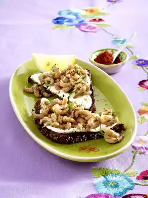 Season the sour cream with salt and pepper and spread it on the bread. Mix crabs and dill, season with salt and lemon juice. Put the prawns on the breads and sprinkle with some cayenne pepper. Cut the breads diagonally in half and serve immediately