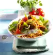 Add cabbage and fry. Stir in tomatoes and sausage, add vegetable stock and braise for about 10 minutes. Drain the pasta and let it drain. Heat 1 tablespoon of oil in a frying pan and fry the noodles until crispy. Season the vegetable sausage pan with vinegar, salt and pepper. Fold under the noodles. Sprinkle with caraway seeds and garnish with parsley