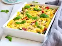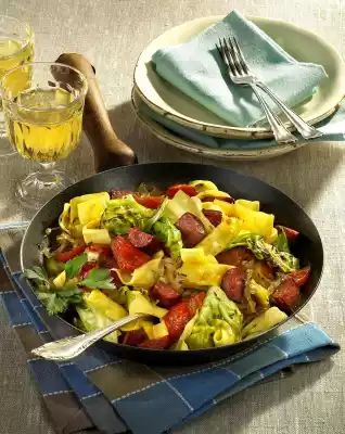 Add cabbage and fry. Stir in tomatoes and sausage, add vegetable stock and braise for about 10 minutes. Drain the pasta and let it drain. Heat 1 tablespoon of oil in a frying pan and fry the noodles until crispy. Season the vegetable sausage pan with vinegar, salt and pepper. Fold under the noodles. Put crème fraîche as a blob on the pan, sprinkle with caraway seeds and garnish with parsley