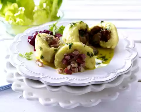 Place 1 slice of dough on each floured palm and press it flatter if necessary. Add 2 teaspoons of filling to each slice and form the potato dough into a dumpling. Process the remaining dough and the remaining fillings in the same way, filling 6 dumplings with bacon and 6 with mushrooms.