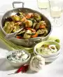 Remove the potatoes from the oven, cut the baked potatoes lengthwise to the middle. Put 1 teaspoon of butter, 1 pinch of salt, approx. 1 teaspoon of cheese into each incision and mash everything with the inside of the potatoes to a pulp. Press the potato mixture back into the peel halves and arrange on plates with some lamb's lettuce and grated carrots, steak strips and yoghurt dip. Sprinkle with pepper. Add the remaining lamb's lettuce and grated carrots