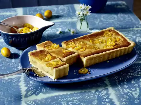 Take the tart out of the oven and let it cool down. Press the tart out of the mould and let it cool down. Serve the kumquat ragout with the tart.