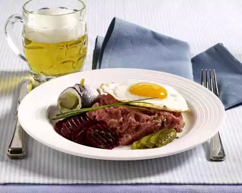Drain the potatoes and add to the corned beef. Add 6-8 tablespoons beetroot juice and approx. 4 tablespoons cucumber water and mash to puree. In the meantime heat 1 tablespoon of fat in a large pan and fry 4 fried eggs.