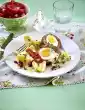 Wash, peel and cut the potatoes into pieces. Cover the potatoes and cook them in little boiling salted water for about 20 minutes. Drain beetroot and gherkins and collect the stock. Chop 300 g beetroot and 200 g g gherkins.