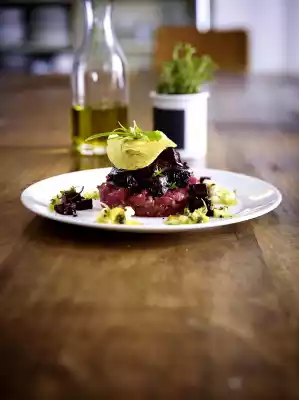 Remove the beetroot from the oven. Arrange the steak tartare on 4 plates with the help of a dessert ring (approx. 6 cm Ø). First put beetroot, then the chips on top and garnish with herbs. Spread the egg vinaigrette around it