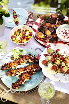 Put the meatballs and apricots alternately on skewers. Grill on the preheated grill while turning for about 10 minutes. Serve with sesame and pomegranate dip