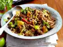 Peel and possibly halve the shallots. Peel and slice the garlic. Wash lemon thoroughly and peel thickly as desired. Cut into slices. Dab lamb dry and dice.