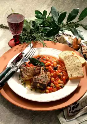 Rinse beans cold and drain. Stone and halve olives. Add the beans and olives to the tomato sauce and warm up for 5 minutes. Season the sauce with salt, pepper and herbs. Remove bay leaf.