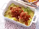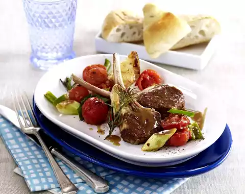 Heat 1 tablespoon of oil and fry the chops for approx. 5 minutes, turning them over. Add garlic and rosemary and fry for about 1 minute. Heat 1 tbsp. oil in a second pan and braise the tomatoes and onion pieces in it for about 4 minutes.