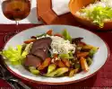 At the same time, heat the remaining oil and sauté the remaining onion until transparent. Pour beans into a sieve, drain well and toss in onion oil. Serve the beans, meat, sauce with carrots put aside and pepper on plates.