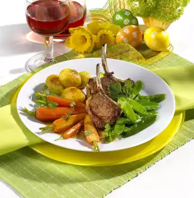 Heat 2 tablespoons of oil in a second frying pan and bake the potatoes for about 6 minutes, turning them until golden brown. Season with salt and pepper. Remove meat from the pan and keep warm. Deglaze the meat with lamb stock and let it boil down for 4-5 minutes.