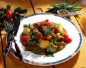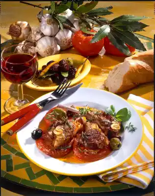 Peel the garlic and cut into wafer-thin slices. Clean and wash the tomatoes and cut them into thick slices. Wash and chop the herbs. Wash chops and dab dry. Heat 3 tablespoons of olive oil. Steam the tomatoes, half of the garlic and herbs in it at medium heat for 5-8 minutes. Season with salt and pepper.