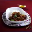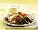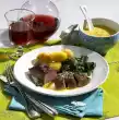 Turn 1x. In the meantime heat 3 tablespoons of oil in another pan. Fry the chops on each side over high heat until golden brown. Also season with salt and pepper, remaining garlic and herbs. Fry over medium heat for about 5 minutes. Briefly toss the olives in the frying fat. Serve garnished with fresh basil