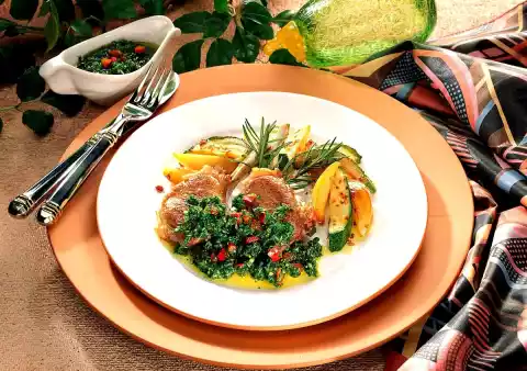 Wash the rosemary and put something aside for garnishing. Pluck off the remaining rosemary needles. Wash the lamb chops and dab dry. Fry the potatoes in half the heated lard, turning for about 10 minutes, zucchini and rosemary for about 5 minutes.