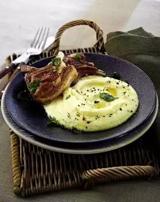 Wash mint, shake dry. Pluck the leaves from the stalks. Heat 5 tablespoons of oil in a saucepan. Roast the mint leaves in it at medium heat for 3-4 minutes until crispy. Wrap chops out of the foil, arrange with puree on plates, sprinkle with mint oil