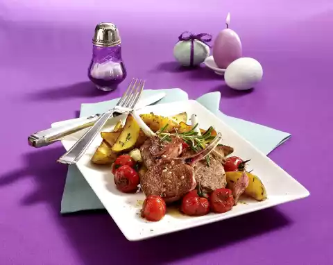 Fry the chops on each side for about 2 minutes. Take the chops out of the pan, beat them in aluminium foil and let them rest. Put the rest of the chops into the pan and fry them in the same way, wrapping them in aluminium foil. Add tomatoes to the frying fat and fry for 2-3 minutes. Finely chop the needles of 1 sprig of rosemary and add to the potatoes. Arrange rosemary potatoes, lamb chops and braised tomatoes, sprinkle with salt and garnish with rosemary