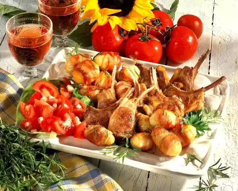 Remove the potatoes from the pan. Rinse the lamb chops in cold water, dab dry and fry in the cooking fat on each side for about 2 minutes. Season with salt and pepper. Arrange potatoes, chops and tomato salad on a plate and garnish with salad, rosemary and parsley as desired.