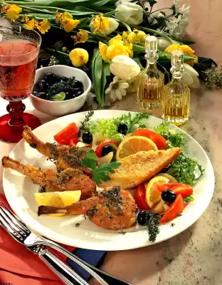 Turn chops first in egg, then in breadcrumbs. Heat the remaining oil. Fry the chops on each side for about 3 minutes until crispy. Season tomato salad again and arrange with the chops. Garnish with lemon and salad if desired. Goes well with garlic baguette