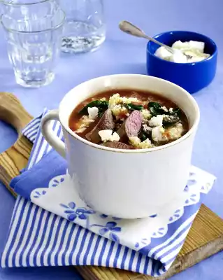 Puree the soup, season to taste with salt, pepper, sugar and coriander, stir in the spinach briefly. Cut meat into slices. Distribute the couscous in soup bowls, pour the soup on top and spread the meat on top.