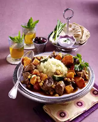 Remove cinnamon from the meat pot. Season lamb with salt, pepper and chilli. Serve with couscous. Serve with yoghurt, flat bread and olives. I like to nibble on raw spring onions.