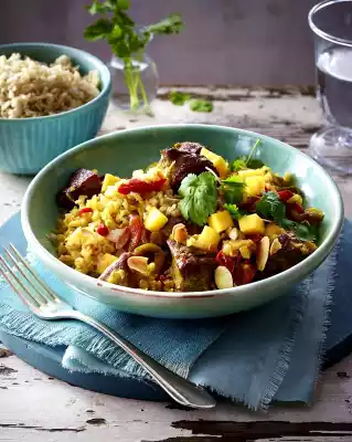 Approximately 10 minutes before the end of the cooking time, add half of the rice to the meat and braise. Take the roast out of the oven, stir well again and arrange in bowls. Add the rest of the rice. Sprinkle mango and almonds over the lamb curry.
