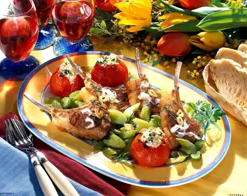 Deglaze with broth and cook for 6-8 minutes. Season with salt and pepper. Arrange lamb chops with celery and the grilled tomatoes on a plate. Sprinkle with parmesan slices and serve garnished with the remaining parsley.