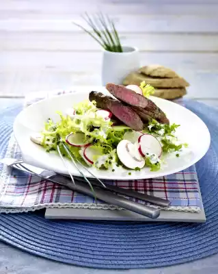 Cut the lamb filets diagonally in half and arrange on the salad. Serve with ##dressing## and garnish with chive tips.