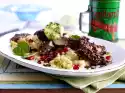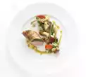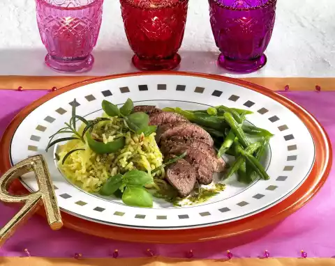 Drizzle pesto on it. Sprinkle with remaining pine nuts. Serve with the fillets and beans. Serve generously garnished with fresh herbs.