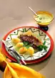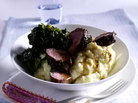 Fry the onion slices in the frying fat. Add the spinach and let it collapse completely. Season with salt and pepper. Drain the potatoes. Add yoghurt and mash to puree. Season to taste with salt and pepper.