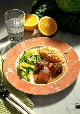 Collect the juice while doing so. Add the orange filets and juice to the cabbage 5 minutes before the end of the cooking time. Wash the lamb fillets and pat them dry. Rub with coriander and pepper. Heat the oil in a pan.