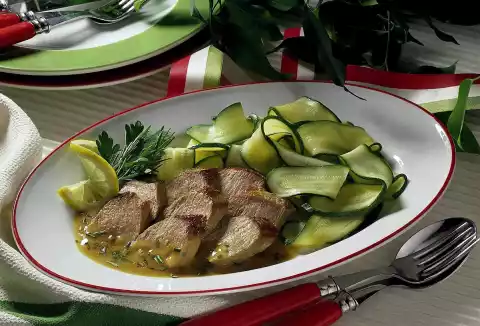 Heat the remaining fat in a pot and sauté the zucchini in it. Add some water and steam for a few minutes. Season with salt and pepper. Cut the meat into slices and serve with sauce and vegetables.