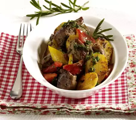 Add the lamb pieces and rosemary, except for something to garnish, and fry for 3-4 minutes. Season with salt and pepper. Remove from the pan and keep warm. Cut potatoes in half. Fry the potatoes and the pepper carrots in the frying oil while turning for 3-4 minutes.