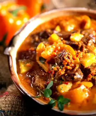 In the meantime clean, wash and cut the peppers into pieces. Drain the mango. Cut the flesh into pieces. Add lentils, paprika and mango to the goulash. Cook for another 20 minutes. Season again and refine with yoghurt. Serve garnished with mint