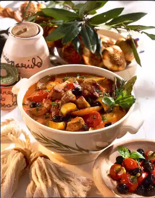 Dust with flour. Deglaze with 1/2 litre water and canned tomatoes. Cover and braise for about 1 hour. Add zucchini after 30 minutes. Wash and chop the herbs. Add olives and herbs to the goulash for the last 10 minutes.