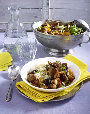 Add stock and bring to the boil. Cover and braise over medium heat for 1 1/2-1 3/4 hours. Add tomatoes and apricots about 30 minutes before the end of cooking time. Cook rice in boiling salted water according to package instructions.