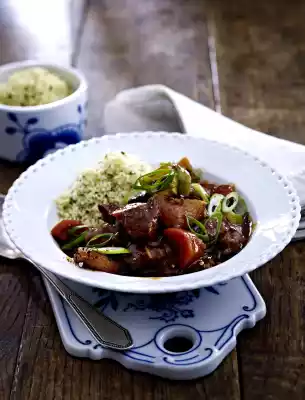 Wash and clean the spring onions and cut them into thin rings. Season goulash with salt, pepper, cinnamon and paprika. Arrange couscous and goulash on plates and sprinkle with spring onions