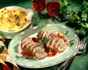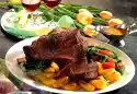 Sweat tomato paste in it. Add stock and wine. Boil up, add thyme and simmer for 1-2 minutes. Press the herb crust onto the meat. Place on the sauce. Roast in the preheated oven (electric cooker: 225 °C/ convection oven: 200 °C/ gas: level 4) for 20-25 minutes. Steam beans in little boiling salted water for 15-20 minutes. Fry potatoes in 2-3 tablespoons of hot oil for about 15 minutes. Add rosemary and fry briefly. Season potatoes. Remove and keep warm. Fry bacon in frying fat until crispy. Add remaining onion and fry briefly. Drain the beans and let them drain. Swivel with the tomatoes in the hot bacon mixture. Let the meat rest for about 5 minutes and cut it open. Arrange everything