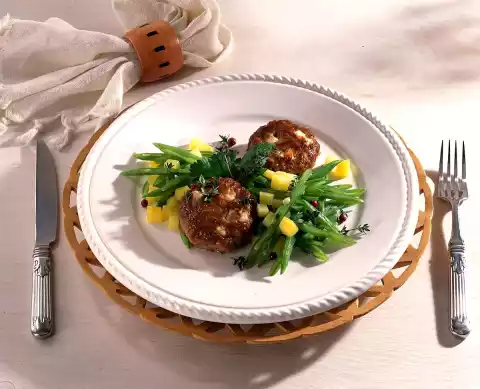 Heat the rest of the oil in a frying pan. Brown the meatballs in it and take them out. Then continue to roast in the preheated oven (electric cooker: 175 °C/ gas: level 2) for about 8 minutes. In the meantime, clean the beans and cut them into rhombs. Cook in boiling salted water for about 7 minutes. Peel and dice potatoes and cook in boiling salted water for about 5 minutes. Peel and chop the shallot. Drain the beans. Heat butter. Sauté the beans and shallot.