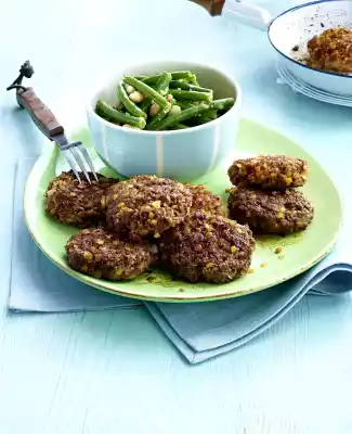 Heat 1 tablespoon of olive oil in a frying pan. Fry the meatballs for 10-12 minutes while turning. Arrange the meatballs with the bean salad