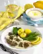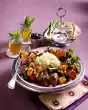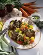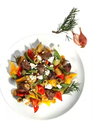Remove from the pan. Fry peppers, shallots, garlic and rosemary in the frying fat for about 8 minutes. Season with salt and pepper. Halve the olives. Add meat and olives and heat up with. Sprinkle feta cheese over the pan dish just before serving