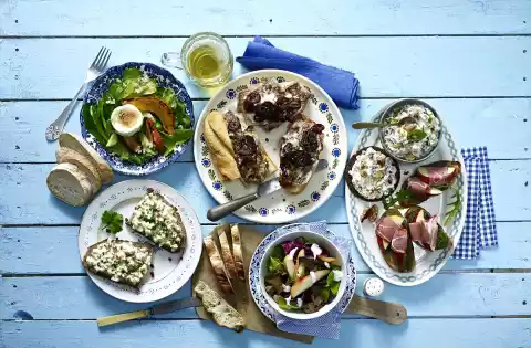 Mix salad with vinaigrette, arrange in bowls with pumpkin slices and cheese eaters. Tastes good with baguette bread