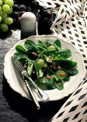 Add vinegar, oil, salt and pepper to the hot pan and toss briefly. Set aside. Mix lamb's lettuce and grapes loosely and divide into four plates. Crumble the crispy bacon slices and sprinkle over the salad.