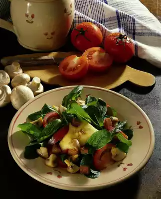 Carve tomatoes crosswise, blanch with boiling water, peel, quarter, seed and cut into cubes. Clean lamb's lettuce and wash thoroughly. Remove the crusts from bread and cut into cubes. Heat half the fat in a pan and roast the bread cubes in it until golden brown. Clean, wash and quarter the mushrooms and fry them in the remaining fat until golden brown. Bring 100 ml water to the boil, stir in mashed potato powder and season with vinegar, salt, pepper, mustard and curry. Arrange the salad on plates and add the potato sauce