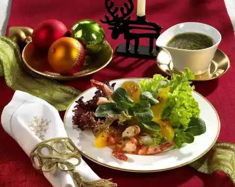 Wash the shrimps, except for the tail fin, peel and remove the intestines. Peel oranges so that the white skin is completely removed. Remove the fillets with a sharp knife between the parting skins.