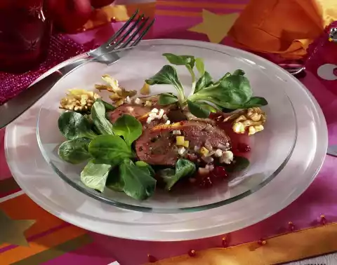 Remove the duck breast from the pan and let it rest for a short time. Clean and wash the lamb's lettuce, mix with half of the vinaigrette and arrange on plates. Cut the duck breast open and arrange on plates.