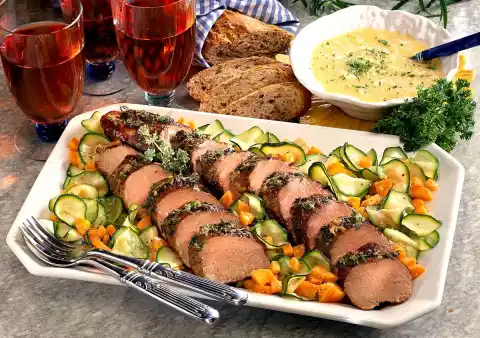 Season with lemon pepper and arrange on a plate. Cut the meat into slices and place on the vegetables. Serve garnished with thyme. Serve with fresh rye baguette.
