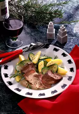 Add the anchovies to the frying fat and sauté briefly. Finely chop rosemary needles, add and deglaze with cream, bring to the boil. Cut the meat open and serve with the vegetables and sauce. Sprinkle with coloured pepper.