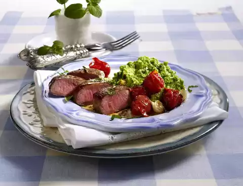 Cover and simmer on low heat for 8-10 minutes. Wash the meat and dab dry. Heat oil in a pan. Add meat with garlic and rosemary to the pan. Fry meat on each side for 2-3 minutes. Season with salt and pepper, take everything out of the pan and wrap in aluminium foil. Put the tomatoes in the hot frying oil and braise them for 2-3 minutes. Season with salt and pepper. Puree peas in the cream with a blender. Wash mint, dab dry and cut into fine strips. Mix mint, except for 1 tablespoon, into the puree. Season everything once again.