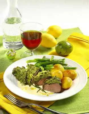 Puree herbs and toast. Mix in egg and garlic. Season with salt and pepper. Spread on the lamb salmon and press down firmly. Cook in the preheated oven (electric cooker: 200 °C/ convection oven: 175 °C/ gas: level 3) for about 10 minutes. Fry the potatoes in 2 tablespoons of hot oil while turning for about 8 minutes. Season with salt and pepper. Cook the beans in boiling salted water for 4-5 minutes, drain. Warm the hollandaise sauce while stirring, refine with lemon peel. Slice lamb, arrange on plates with potatoes, beans and sauce. Serve garnished with rosemary