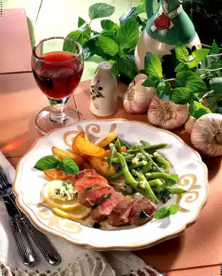 Peel and chop the onion. Heat 1 tbsp. butter in the frying fat. Fry onion until transparent. Drain beans and toss briefly. Arrange everything with the mint butter. Garnish with remaining mint and lemon. Roast potatoes taste good with it